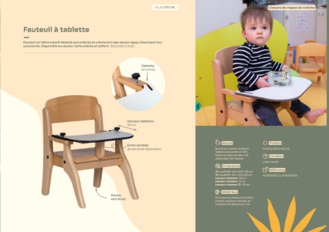 Fauteuil en hêtre massif destiné aux enfants en crèche lors des temps repas, favorisant leur